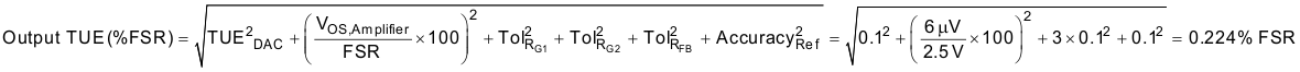 4.出力誤差は、DAC TUE、アンプのオフセット電圧、抵抗の公差、基準電圧の初期精度から、二乗和平方根 (RSS) 分析を使用して概算できます。