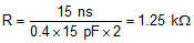 バスに接続されている2つのコンポーネント部品(それぞれ容量 C = 15pF)があり、入力(2V)には最大立ち上がり時間 10ns/V および t = 15-ns の合計立ち上がり時間が必要と仮定すると、抵抗の最大サイズは式 5で計算できます。