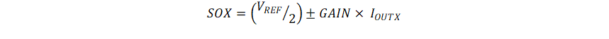 Figure 3-1 Current Sense Amplifier ArchitectureThe SOx pin on the DRV8376 outputs an analog voltage proportional to the current flowing in the low-side FETs multiplied by the gain setting (GCSA). The gain setting is adjustable between four different levels which can be set by the GAIN pin (in the hardware device variant) or the GAIN bits (in the SPI device variant).The current sense is implemented with the sense FET on each low-side FET of the DRV8376 device. This current information is fed to the internal I/V converter, which generates the CSA output voltage on the SOx pin based on the voltage on the VREF pin and the Gain setting. The CSA output voltage can be calculated as: