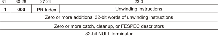 If present, the descriptors follow the unwinding instructions. The format of the descriptors is a sequence of descriptor entries followed by a 32-bit zero (NULL) word. Each descriptor starts with a scope, which identifies what kind of descriptor it is and specifies a program address range within which the descriptor applies. Additional descriptor-specific words follow the scope.