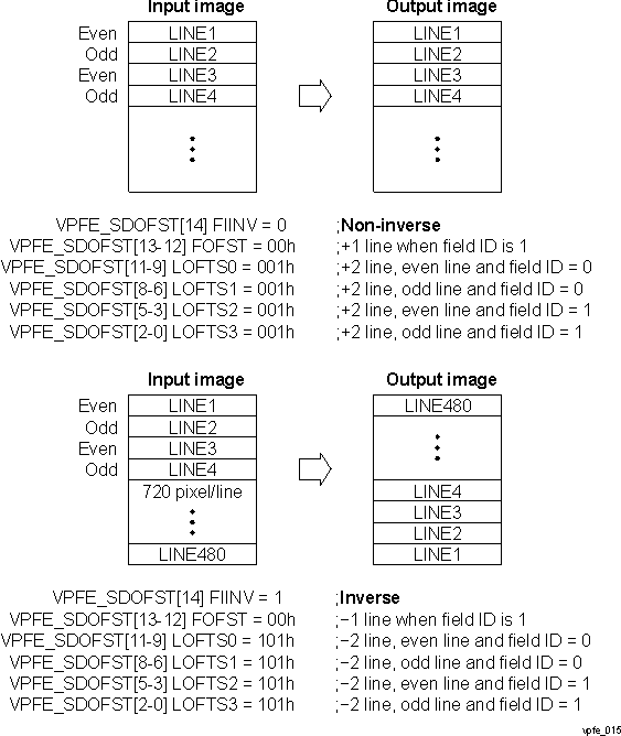 The final stage of the raw data mode is the line output control, which controls how the input sensor lines are written to external memory. The value of the bits in the VPFE_SDR_ADDR register defines the starting address where the frame should be written in external memory. The value of the VPFE_HSIZE_OFF[15-0] LNOFST bitfield defines the distance between the beginning of output lines in bytes. Both the starting address and line offset must be aligned to 32-byte boundaries (that is, either 16 or 32 pixels, depending on the VPFE_SYNMODE[11] PACK8 bit). Use the VPFE_SDOFST register to define additional offsets, depending on the field ID and the even/odd line numbers.